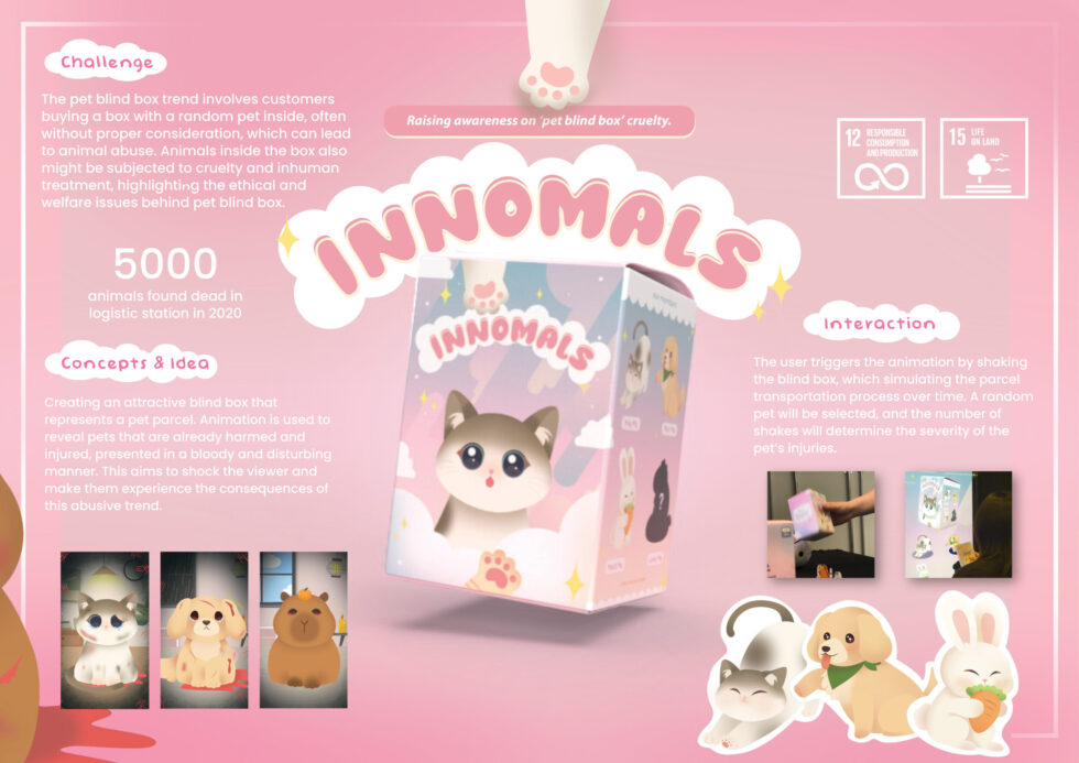 “Innomals” is an interactive project that raises awareness about the ethical issues surrounding the pet blind box trend. Highlighting the cruelty and inhumane treatment involved, this installation uses gacha-inspired animation triggered by users shaking a simulated pet parcel. The animation reveals the condition of random pets, with the number of shakes determining the severity of their injuries. By depicting the consequences of this harmful practice, the project aims to shock viewers and inspire action for responsible consumption and animal welfare.